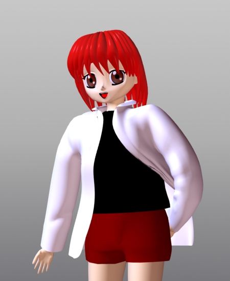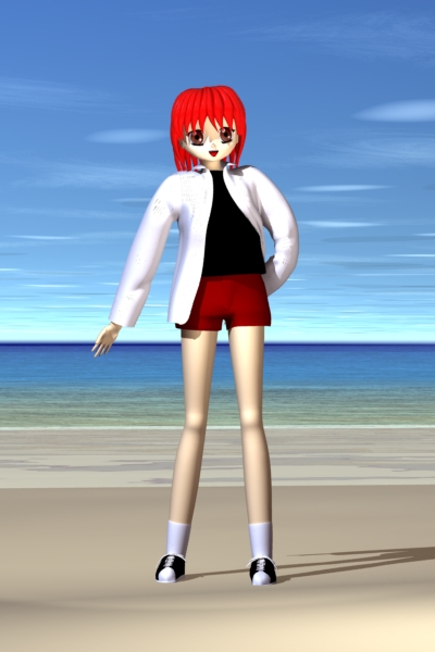 十一月に作ってSUMMERなんて、お恥ずかしい限りですが、 キャラと衣装を考えて作り始めたころは、夏だったんです。 なんか上のイメージは、本物のフィギュアをデジカメで撮ったみたいで、CGっぽくないですね。 下のは、以前に作った海岸に置いてみました。 顔の影がうまく消せませんでした。